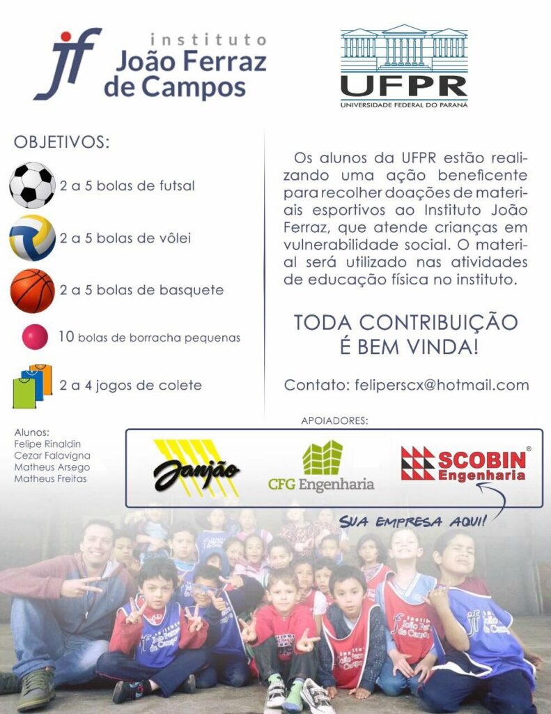 Os alunos das UFPR se mobilizaram para ajudar as aulas do professor de educação física, Daniel Alves, em Pinhais. Com a ajuda das empresas: Janjão artigos esportivos, CFG engenharia e SCOBIN engenharia. Nosso muito obrigado a vocês.