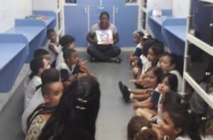 Uma biblioteca-ônibus ficou estacionada próximo ao Museu M.A.R. e as crianças da Escola Padre Dr. Francisco da Motta foram levadas por turma até o ônibus com a finalidade de estimular o gosto pela leitura. Escolheram o livro de histórias A Princesa e o Sapo, que foi contada pela Professora dentro do ônibus.